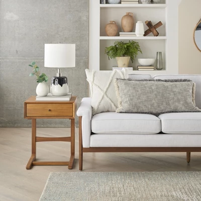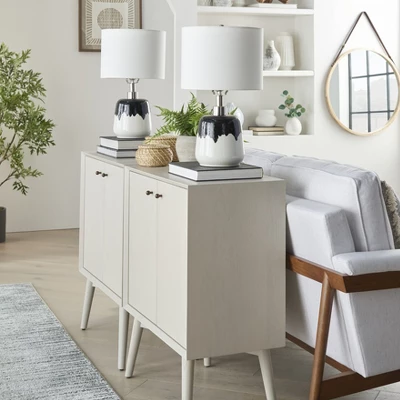 Bring artistic flair to your favorite nook with this modern ceramic table lamp. Its stout, rounded geometric shape features a glossy abstract paint splash design in a speckled white and blue-black hue. Abstract design infuses a unique, artistic feel to the modern home.