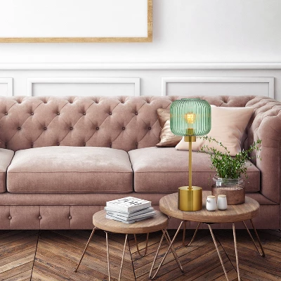 Add some cool, retro-style charm to your lighting with this 21″ H Jasmine Globe Shade Table Lamp from River of Goods. Featuring a brushed gold-finish metal base and a green glass globe shade, this table lamp makes an easy pairing with other glam or retro decor. It requires one 40-watt E26 bulb (not included) and is also LED compatible, and the 60-inch cord allows for versatile placement. Place it on a side or console table in your living room, bedroom or foyer to instantly liven up the space.