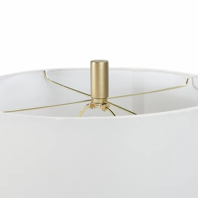 Up the elegance factor on your buffet table or console with this luxe table lamp. Drawing inspiration from vintage Hollywood glam, it features a cinched metal silhouette in gold with a marbled center band. This contemporary lamp is topped with a standard drum shade that casts a bright light into your space.