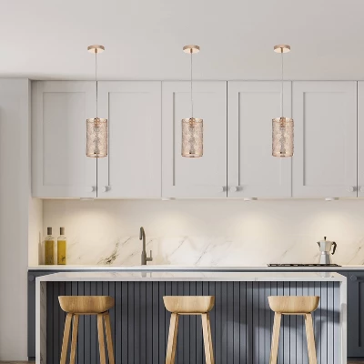 From the entryway to the dining room, the 6″ Madeline Metal Pendant Light from River of Goods makes a lovely way to create a warm and stylish ambiance in your home. Featuring a polished gold metal canopy matched in style by a cylindrical gold-tone metal shade, this hanging pendant light adds an elegant touch to a range of interior decor styles. The shade gets a touch of art deco appeal from triangle motifs set in a geometric fashion that’ll lend any room gleaming opulence when the single bulb shines through. Thanks to its adjustable height design, you can install this metal and glass hanging light directly into your ceiling at your ideal drop length.