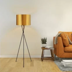 62.25″ Kona Mid-Century Modern Tripod Floor Lamp With Drum Shade Gold/Black – Teamson Home