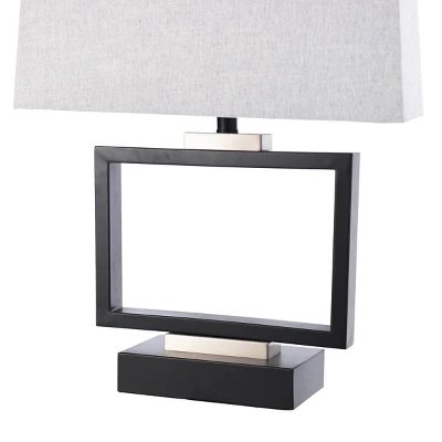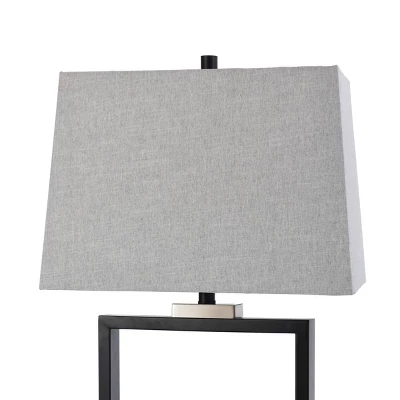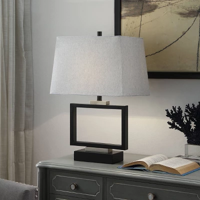 An open design allows this table lamp to bring modern artistry to any dining room or living room. The metal body forms a rectangular outline, with the black metal finish and chrome accents giving the structure a striking presence. A gray fabric shade matches the angular form below while the soft material provides appealing textural contrast. This piece exemplifies superior product design and great styling. It will pair well with modern styling. If you put it in the bedroom or family room, this table lamp stands out. Suitable for residential use in a dry location. Due to lighting and monitor differences, actual colors and finishes may vary slightly from what appears online