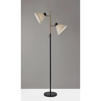 Brighten your space with the mid-century modern flare of the 69″ tall Matthew tree floor lamp. With a geometric design that focuses on the simplicity of clean lines, the lamp’s compact construction fits easily behind or beside furniture. Featuring black metal finish contrasted with antique brass accents, the tree floor lamp has an 11″ diameter round base supporting a thin, tall pole. Attached to the pole by antique brass accent pieces are two cone-shaped shades facing opposing directions. The shades are made of cream textured fabric to softly diffuse the 100W bulbs (not included). The lamp is easily turned on or off with a rotary switch located on the pole and is powered by a 6′ black cord. Complete your décor with the coordinating Matthew floor lamp and table lamp.