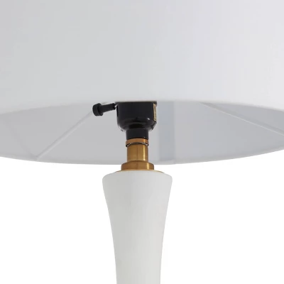 - White table lamp features a tall, tapered design and white shade to diffuse light