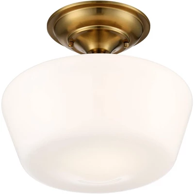 This soft gold finish semi-flush ceiling light fixture is the perfect addition to any room. The simple design features an opal glass cover for a functional and stylish look.